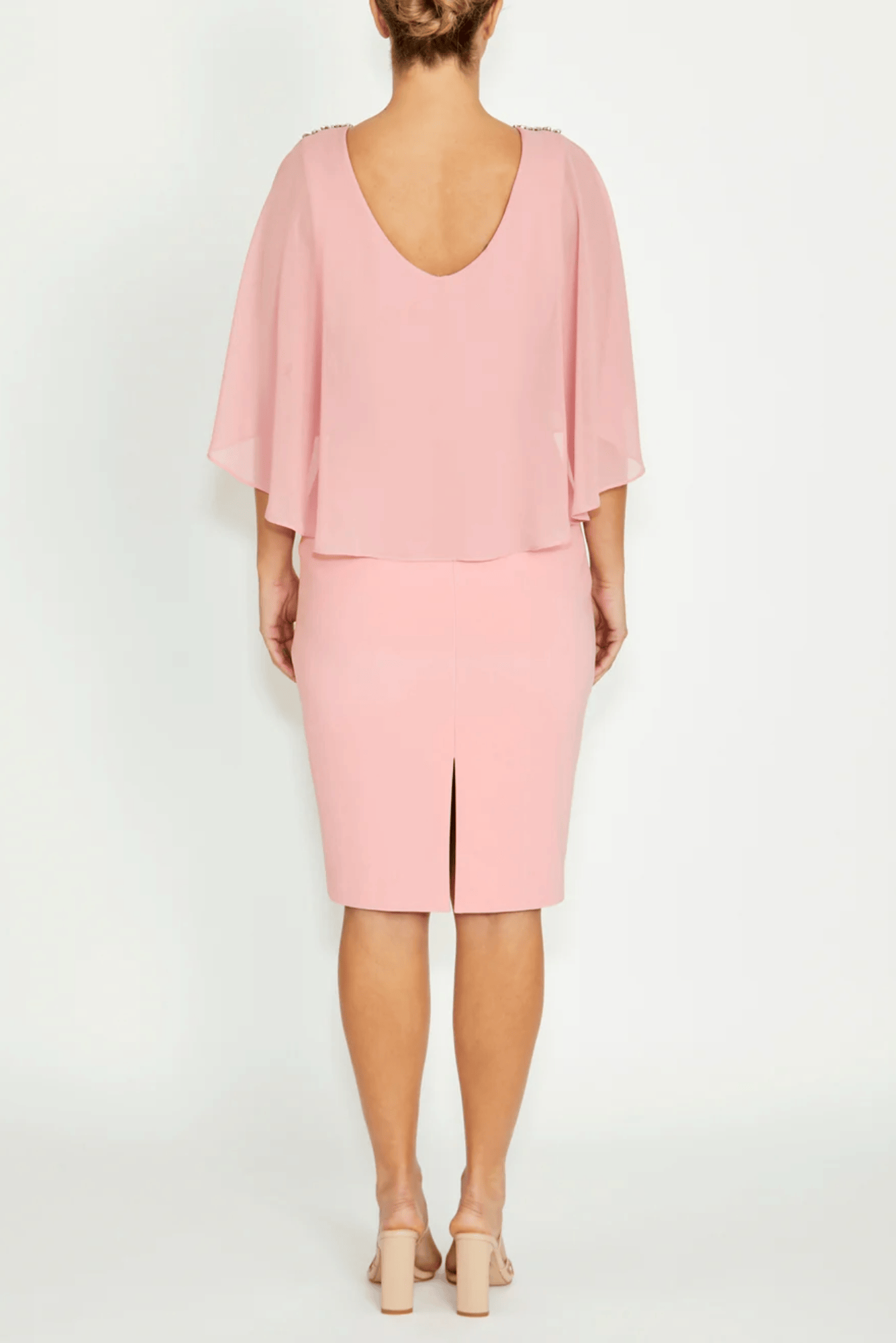 Step into effortless elegance with this blush pink sheath dress, crafted in luxurious stretch bonded crepe for a smooth, flattering fit. A soft chiffon capelet drapes beautifully over the shoulders, while delicate rhinestone embellishments add a touch of refined glamour. Finished with a round neckline, scoop-back detail and an invisible centre-back zip, this dress is the perfect statement piece for cocktail parties, weddings, and evening occasions.